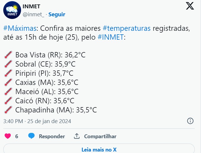Veja, abaixo, quais foram as maiores temperaturas registrada no Brasil nesta quinta-feira (25).