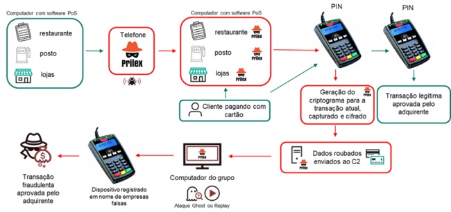 O objetivo é fazer o consumidor inserir o cartão físico na máquina para efetuar o pagamento. Neste momento, o Prilex captura os dados da vítima, sem que ela e o comerciante percebam, e os envia remotamente para os fraudadores, possibilitando a clonagem do cartão para usos indevidos, mesmo que ele seja protegido por chip e senha.