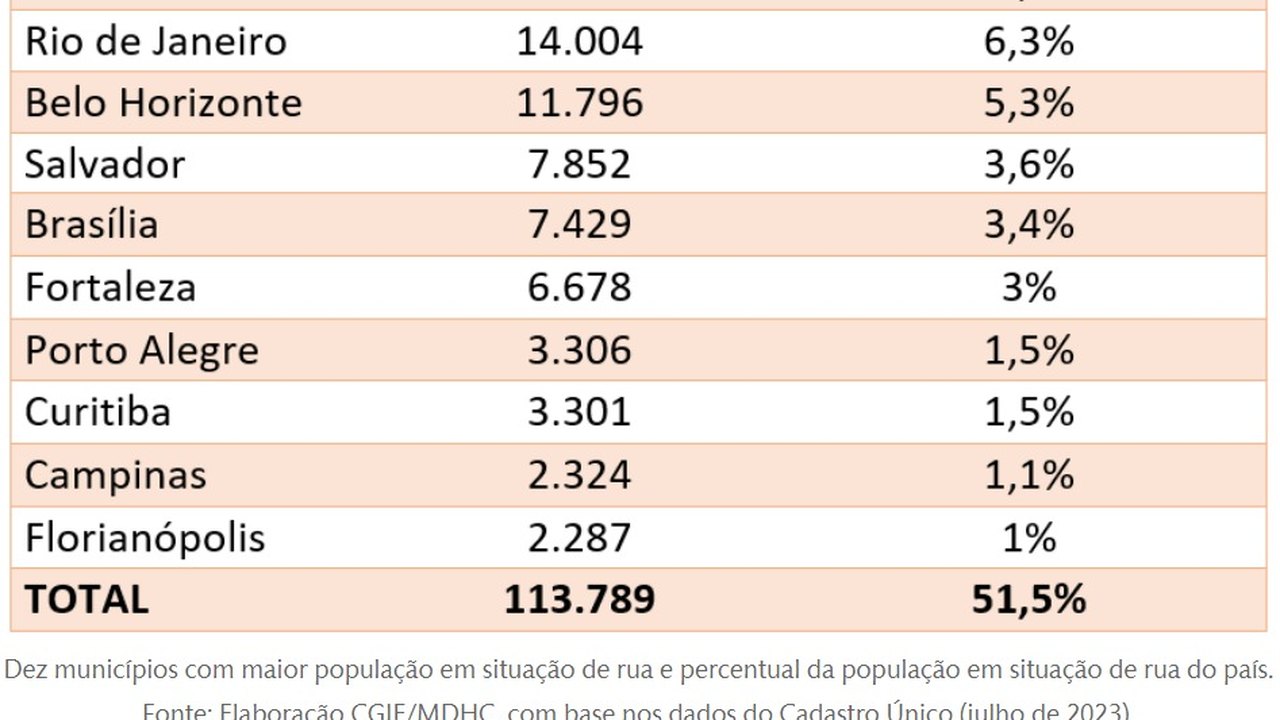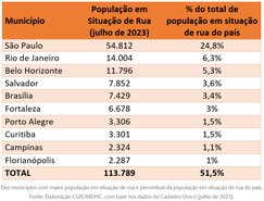 Dentre esses municípios, os 10 primeiros com o maior número de pessoas em situação de rua concentram 51,5% dessa população. São eles: São Paulo, Rio de Janeiro, Belo Horizonte, Salvador, Brasília, Fortaleza, Porto Alegre, Curitiba, Campinas e Florianópolis.