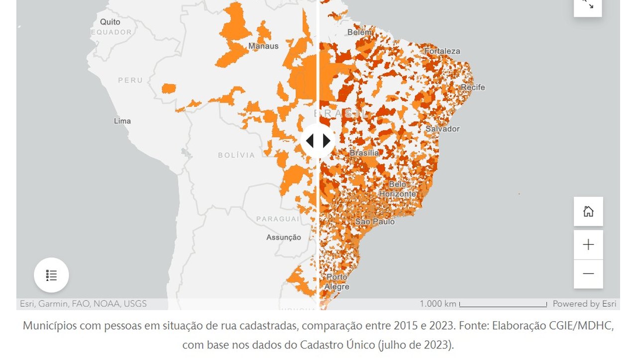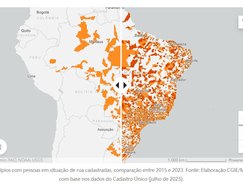 O observatório destaca que "o número de municípios brasileiros com pessoas em situação de rua cadastradas passou de 1.215 em 2015 (22% do total de municípios do país) para 2.354 em 2023 (42% do total de municípios do país)."