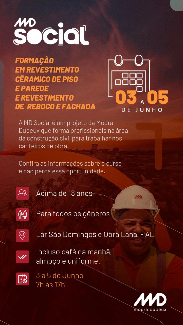 A MD Social, iniciativa da Moura Dubeux, está com inscrições abertas até sexta-feira (31) para os cursos de "Revestimento Cerâmico em Piso e Parede" e "Revestimento de Reboco e Fachada". Voltados para a capacitação de novos profissionais na construção civil, os cursos serão realizados de 3 a 5 de junho em parceria com o Lar São Domingos.