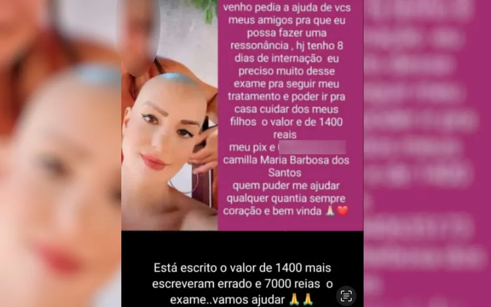 Segundo o investigador, a mulher fala que é portadora de câncer de mama, com metástase no pulmão e intestino, para conseguir doações e dinheiro das vítimas, dizendo ser para financiar seu tratamento.
