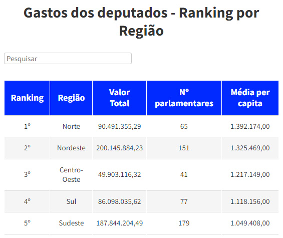 Com apenas 41 deputados, a região Centro-Oeste ficou em terceiro lugar, com um gasto de R$ 49,90 milhões (R$ 1,21 milhão por deputado). No quarto lugar, cada um dos 77 deputados da região Sul gastou R$ 1,118 milhão. Com o maior número de deputados (179), a região Sudeste somou R$ 187,844 milhões em gastos, cerca de R$ 1,05 milhão por deputado.
