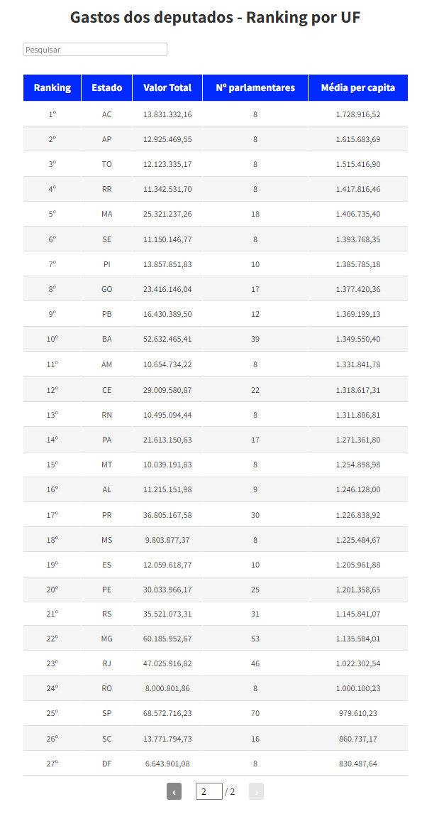 Completam o top 10 de unidades federativas com o maior gasto per capita: Sergipe (R$ 1,39 milhão); Piauí (R$ 1,38 milhão); Goiás (R$ 1,37 milhão); Paraíba (R$ 1,36 milhão); e Bahia (R$ 1,34 milhão). O Distrito Federal foi a UF com o menor gasto: R$ 6,64 milhões para os seus oito deputados, cerca de R$ 830,4 mil per capita.