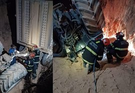 Homem fica preso às ferragens após caminhão carregado de cimento tombar